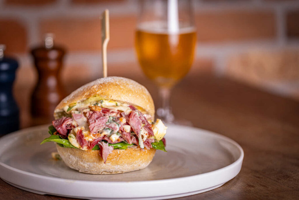 Pulled ham hock sandwich, hot honey, green apple, watercress, egg mayo, sourdough bun | 12.5 405 kcals